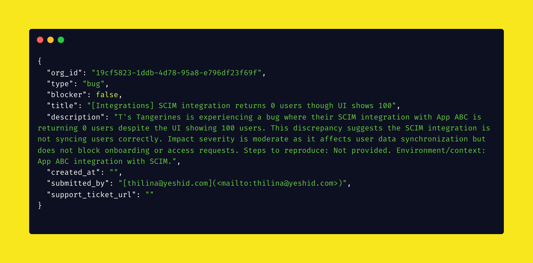 Here's your payload! {"org_id":"19cf5823-1ddb-4d78-95a8-e796df23f69f","type":"bug","blocker":false,"title":"[Integrations] SCIM integration returns 0 users though UI shows 100","description":"T's Tangerines is experiencing a bug where their SCIM integration with App ABC is returning 0 users despite the UI showing 100 users..."}
