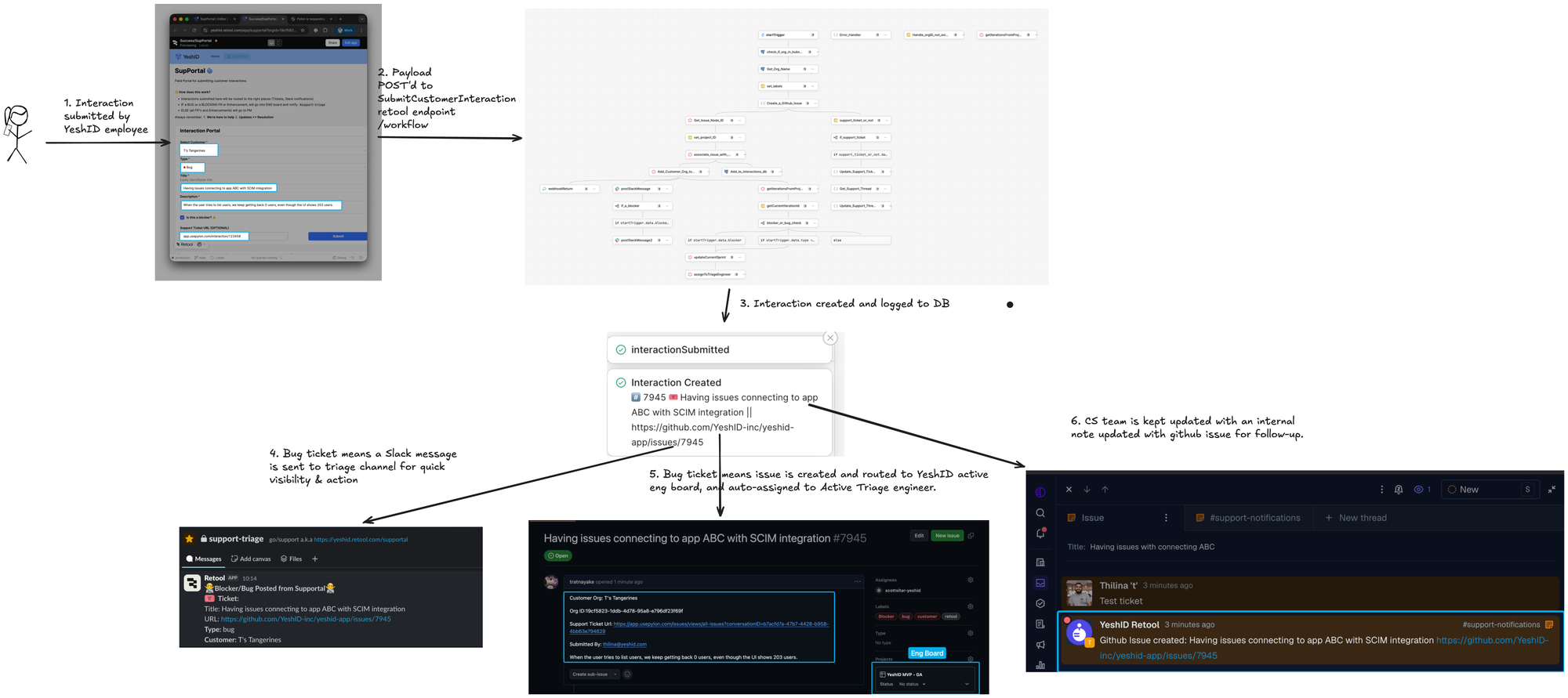 Like many B2B SaaS companies, we had a structured process for collecting customer feedback. Our team would fill out a form with 4-7 fields (organization ID, issue type, title, description, blocker status), which would trigger a Retool workflow to create tickets, route them to project boards, and notify the right teams.